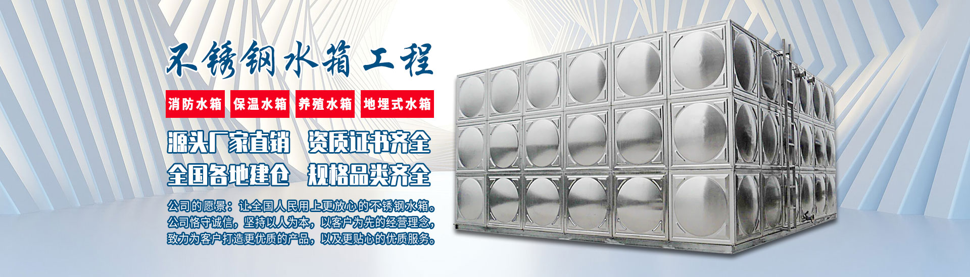 广东冠耐斯给排水设备有限公司的愿景:让全国人民用上更放心的不锈钢水箱。冠耐斯公司致力打造更优质的生活、消防、养殖、灌溉等多用途不锈钢水箱,公司采用符合饮用水标准的SUS304为原料,通过先进自动化仪器、严格的工序流程把不锈钢平板冲压制造出规格板材。生产出品置优良,造型美观的不锈钢水箱。 公司总部落地于千年羊城、南国明珠的广州市。产品质量通过广东省疾病预防控制中心的检疫报告,同时被评为名优产品、信得过产品等20余项产品质量奖项。公司在生产发展的同时也贯彻落实可以续发展的道路。所生产的不锈钢产品全部符合绿色环保理念,100%可回收。生产过程及产品的后续处理不会对环境生态造成影响。 本公司恪守诚信,坚持以人为本,以客户为先的经营理念。致力为客户打造更优质的产品,以及更贴心的···